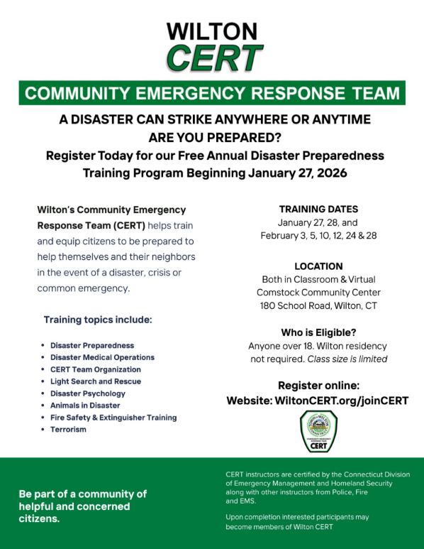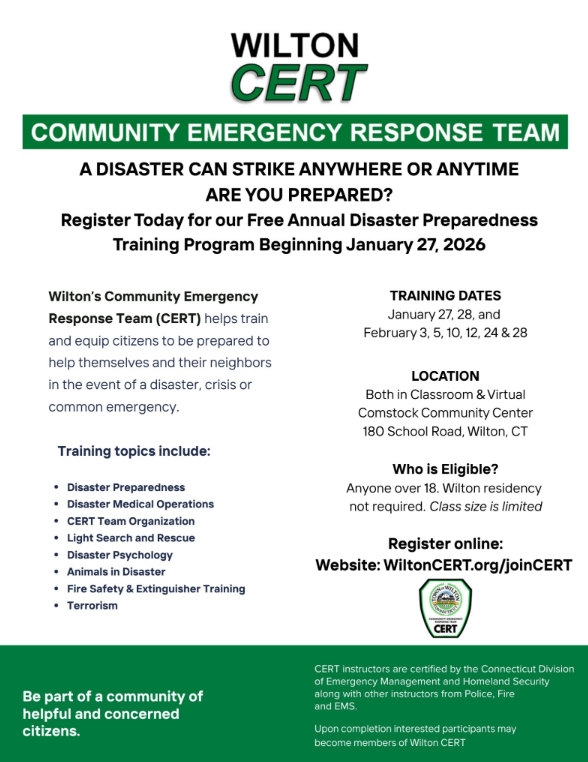 Wilton CERT is now planning the 1st Quarter 2026 Disaster Preparedness Training. CERT is an acronym for Community Emergency Response Team. Training includes basic safety and disaster skills. The CERT program helps train and equip citizens to be prepared to help themselves and their neighbors in the event of a disaster, crisis or common emergency.